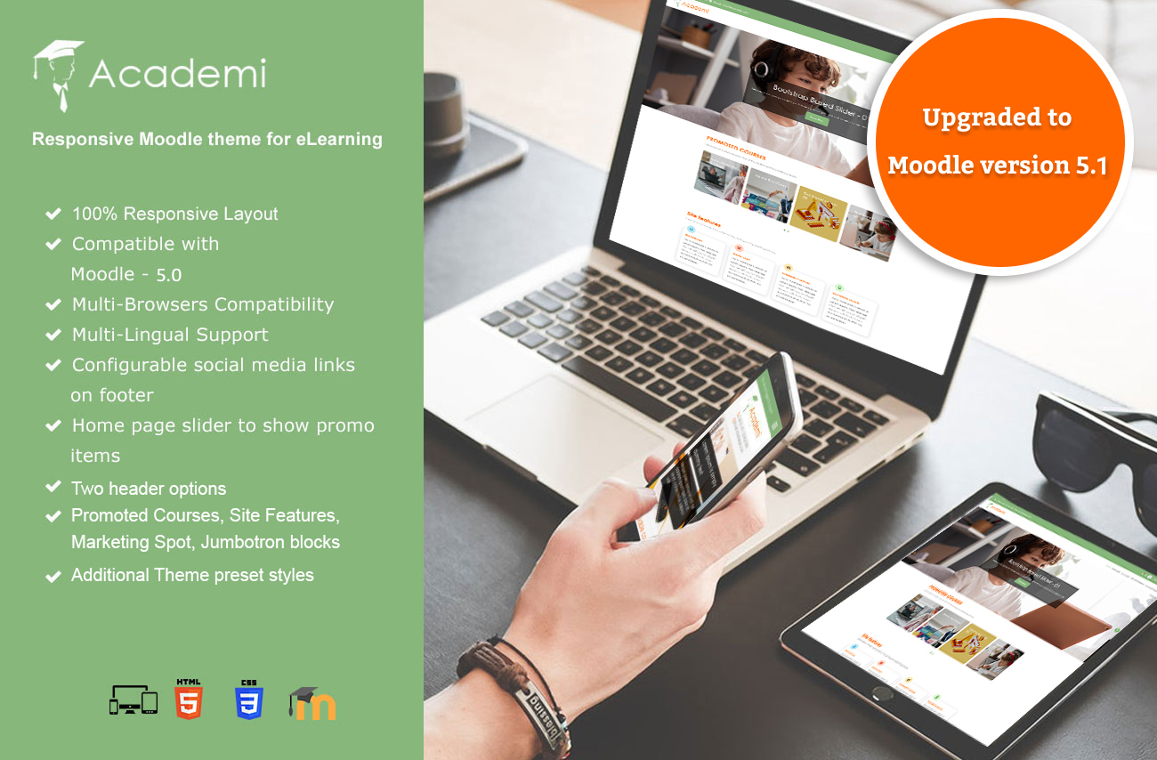 The Academi theme has been successfully released and is now fully compatible with the latest Moodle version 5.1.
